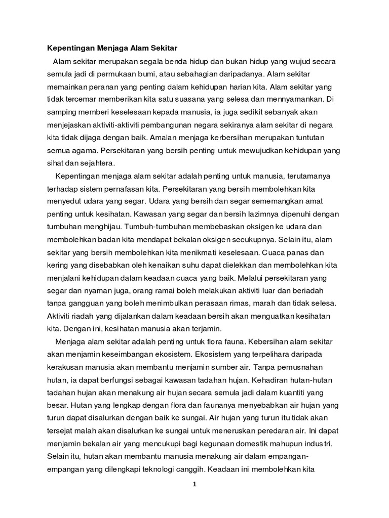 Sebarang bentuk pencemaran dan kerosakan ke atasnya dikira sebagai perbuatan dosa dan maksiat. Karangan Tentang Kepentingan Menjaga Alam Sekitar Kepentingan Memelihara Alam Sekitar Pdf. Alam sekitar merupakan satu anugerah yang tidak ternilai dan tiada galang gantinyadalam satu sidang Kepentingan kitar semula kepada manusia dan alam sekitar.